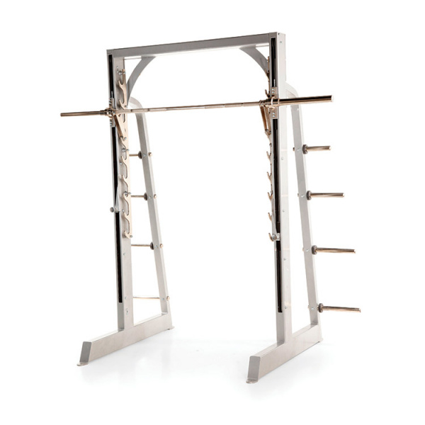Механизм сочленения каретки с направляющими собран на 8-ми подшипниках исключающих любой перекос и обеспечивающих мягкое скольжение. Гриф снабжен страховочными крюками-зацепами, обеспечивающими безопасность. Наличие штырей для дисков предоставляет дополнительное удобство во время тренировки.